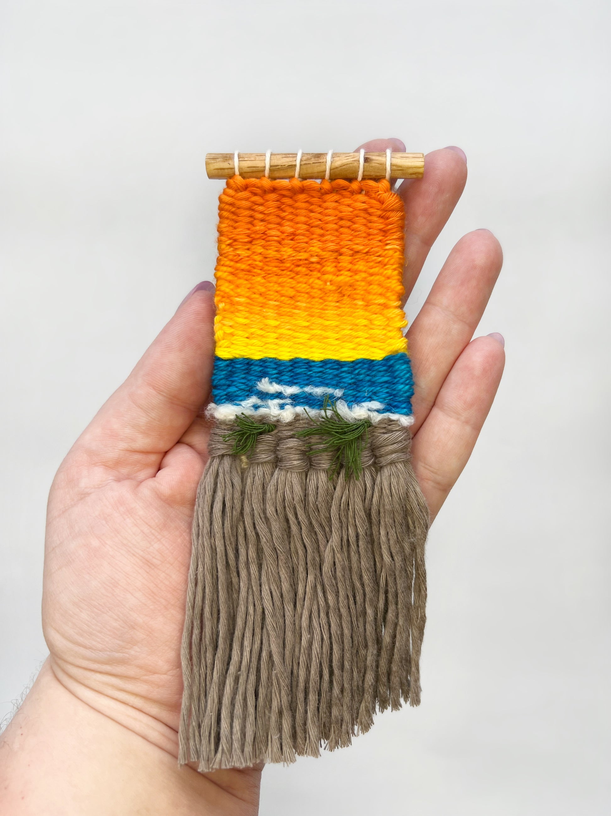 Mini beach inspired woven wall hanging. Made with a variety of cotton and wool fibers. Comes with a string attached so you can hang it on any wall. Handmade, one-of-a-kind.