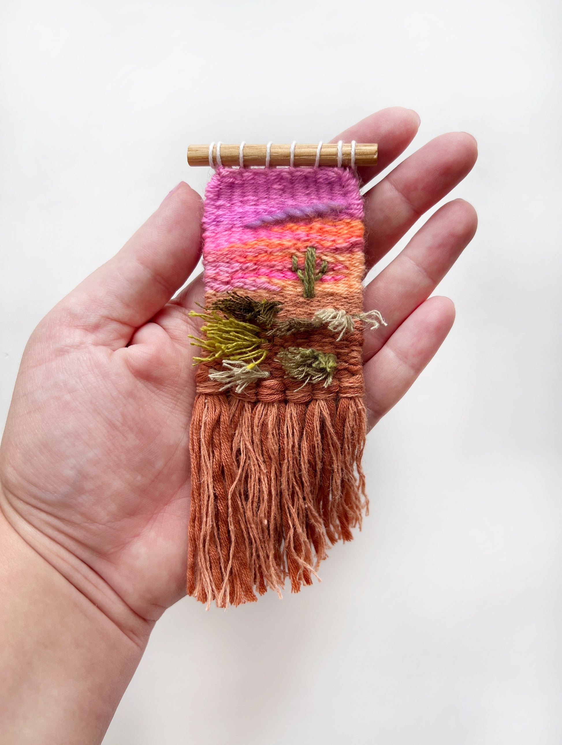 Mini desert inspired woven wall hanging. Made with a variety of cotton and wool fibers, as well as Painted Sky's signature wool roving puffy clouds. Comes with a string attached so you can hang it on any wall. Handmade, one-of-a-kind.