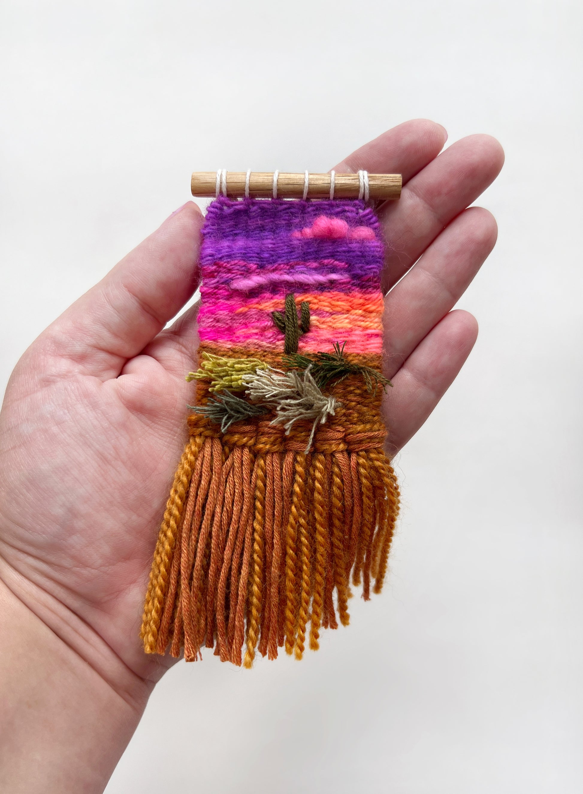 Mini desert inspired woven wall hanging. Made with a variety of cotton and wool fibers, as well as Painted Sky's signature wool roving puffy clouds. Comes with a string attached so you can hang it on any wall. Handmade, one-of-a-kind.