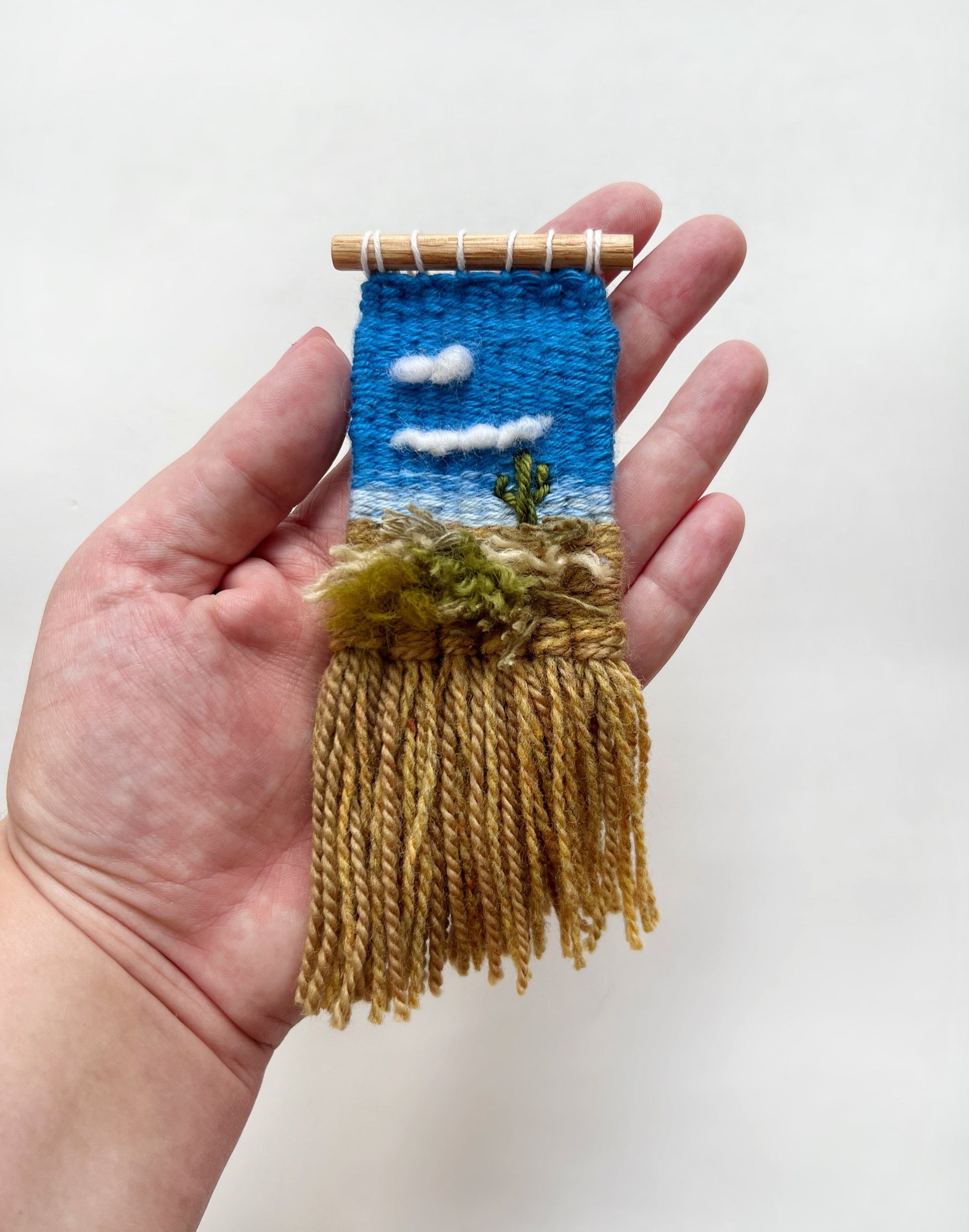 Mini desert inspired woven wall hanging. Made with a variety of cotton and wool fibers, as well as Painted Sky's signature wool roving puffy clouds. Comes with a string attached so you can hang it on any wall. Handmade, one-of-a-kind.