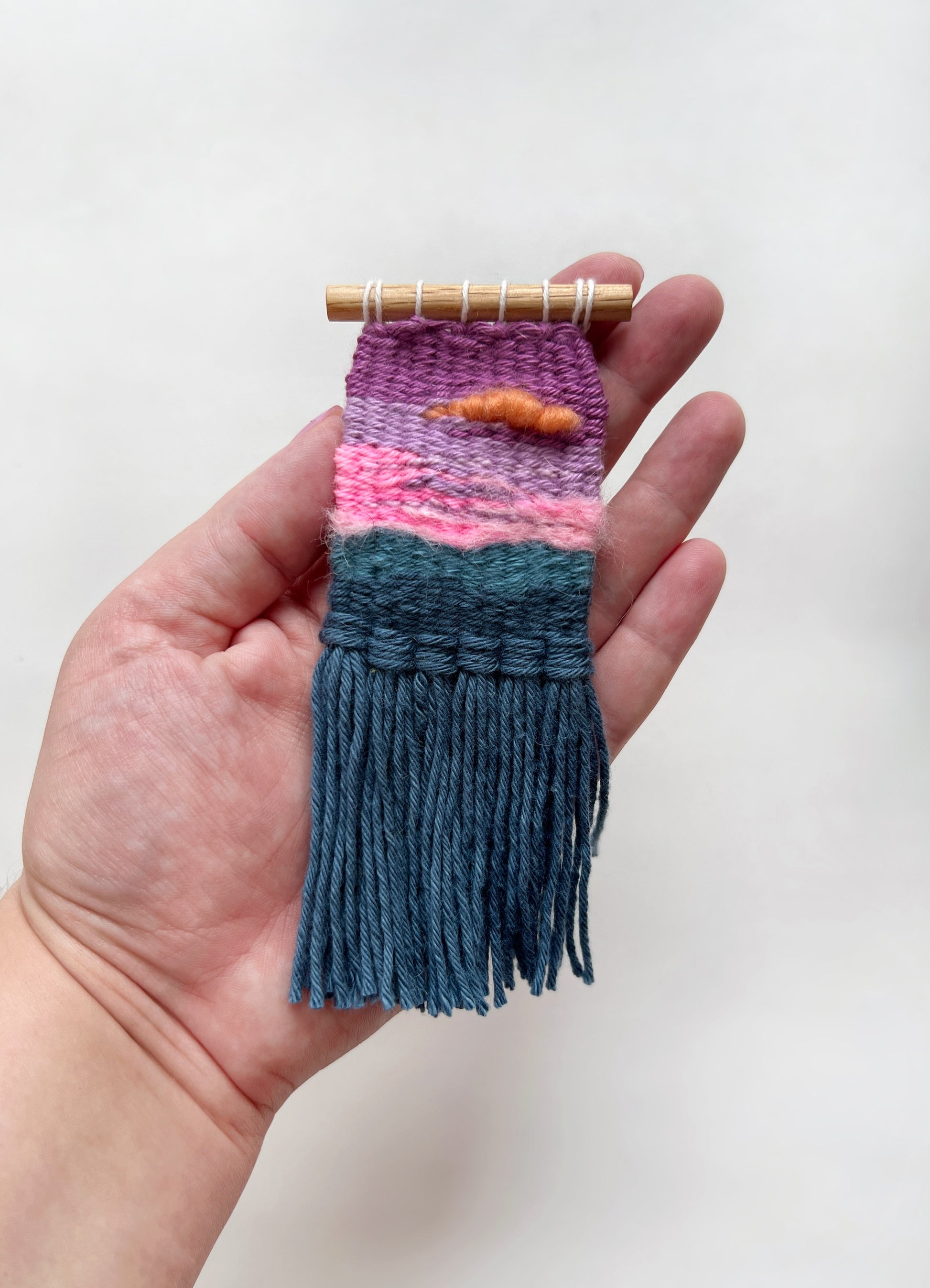 Attached to a 2.25” oak dowel, this mini weaving is 2” x 5.25”.