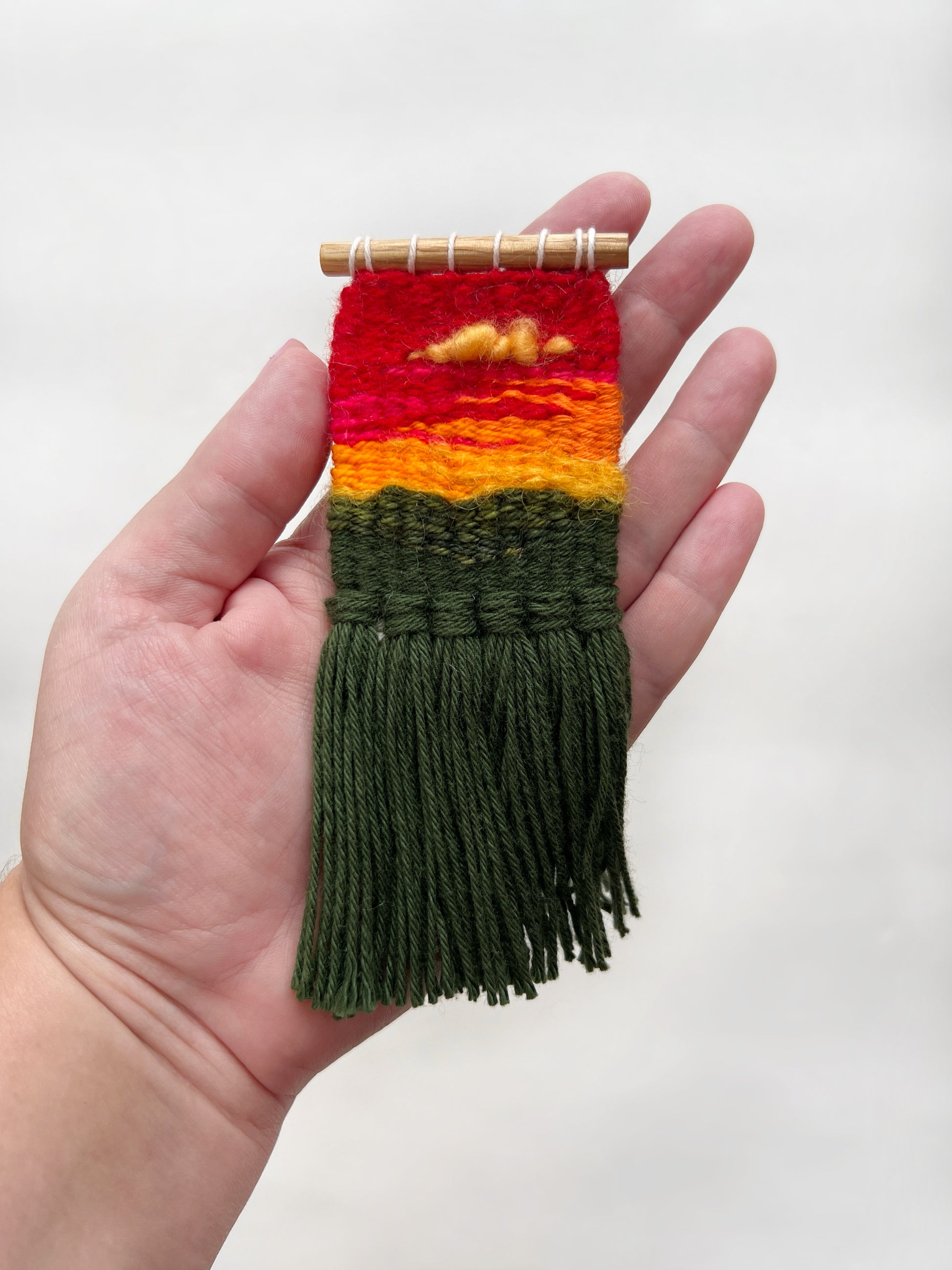 Mini mountain inspired woven wall hanging. Made with a variety of cotton and wool fibers, as well as Painted Sky's signature wool roving puffy clouds. Comes with a string attached so you can hang it on any wall. Handmade, one-of-a-kind.